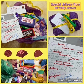 Today they all dressed up as their favourite character, we had some Matilda's, Willy Wonka's, Oompa Loopma's, James and his Giant peach, Ms Trunchball and many more. There was a package sent in the post from Willy Wonka himself full of chocolate and sweets!